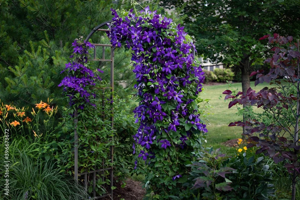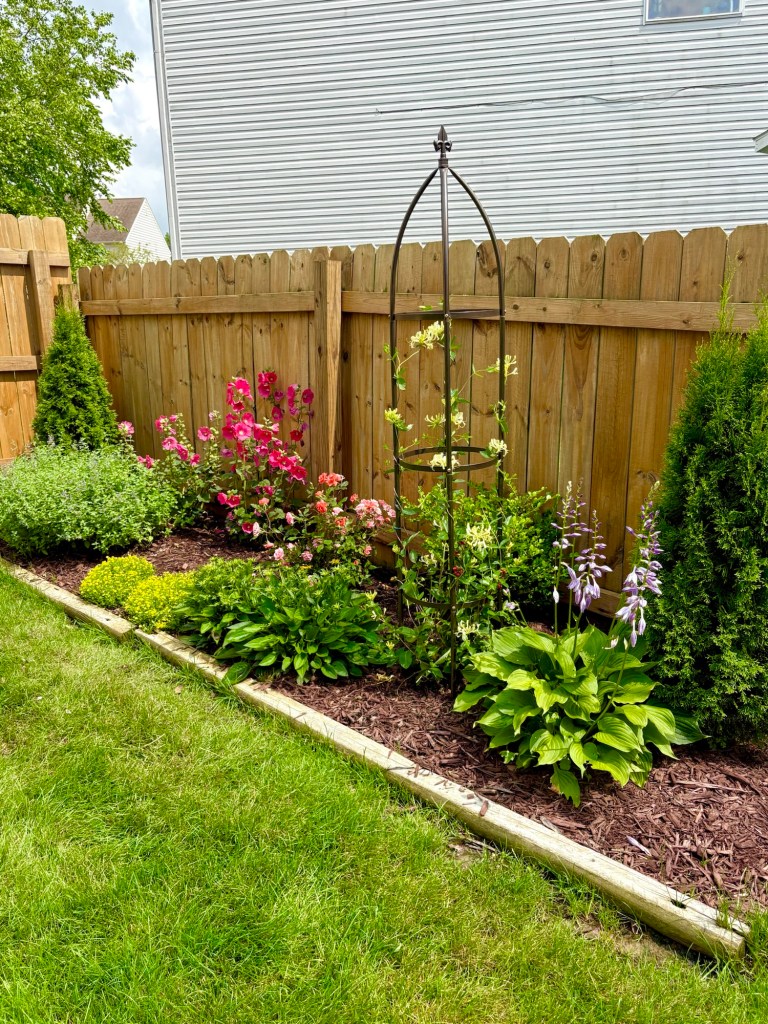 So this spring, when the clematis started growing back, I took the broken-down cedar trellis out and replaced it with a heavy-duty iron trellis that can facilitate the growth of my clematis. It was actually hard to find one sturdy enough for my girl – took some effort. But so far, she’s doing great and the trellis is perfect.